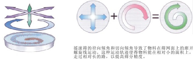摇摆筛是一种仿人工摇动的低频旋振筛,其原理是:瞬时运动为沿径向的位移和以此位移为轴的圆周运动的合成(螺旋运动)。即可调节偏心距的激振器产生了非线性三维运动,物料也产生同样的近似手动作业的运动,从而达到筛分之目的,再配合筛分附件可得到更加理想的筛分效果;适合于圆球状、圆柱状、片状、乃至不规则形状易堵网且需要精密筛分的物料。基本的回转运动与人工筛分相类似。偏心率从25到40mm可调,低速V型皮带驱动从120到360rpm可调,每一种产品的停留时间可以通过摇摆筛的径向与切角朝驱动轴线方向进行调整。因此建立水平与抛掷三维翻滚运动。物料从中心到外缘在整个筛面上均匀分散,从而以螺旋运动往轴向传播。细小颗粒从而完成了整个筛分过程。水平与垂直加速度随着粒子的运动而增加,接近筛孔尺寸的颗粒随之成功分离;较大颗粒被运到出口处,出口处由一个可调节的导向装置控制流量,该导向装置是控制物料停留时间的另一个因素。此次过程在每筛层之间重复进行。