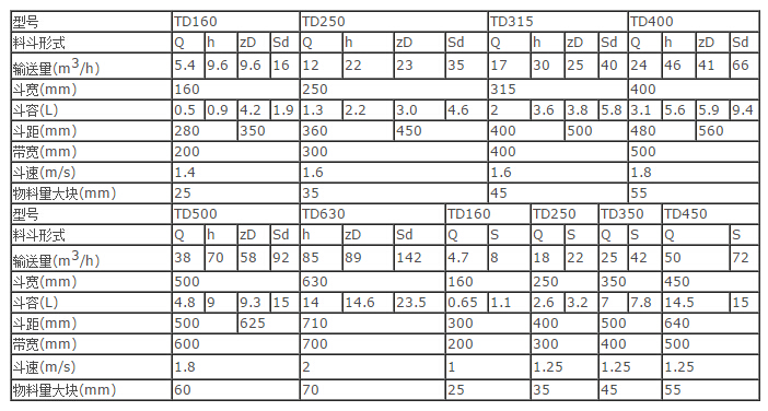 1.表中斗容为计算斗容,输送量按填充系数0.6计算得出。
