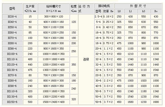 DZ系列电机振动给料机技术参数表所列给料量及振动电机选择是按给料机水平放置选定的,给料机在安装时可下倾015°角,其产量随下倾角度的增加而增加,或在保证产量的情况下,其电机消耗功率会随下倾角增大而减小。